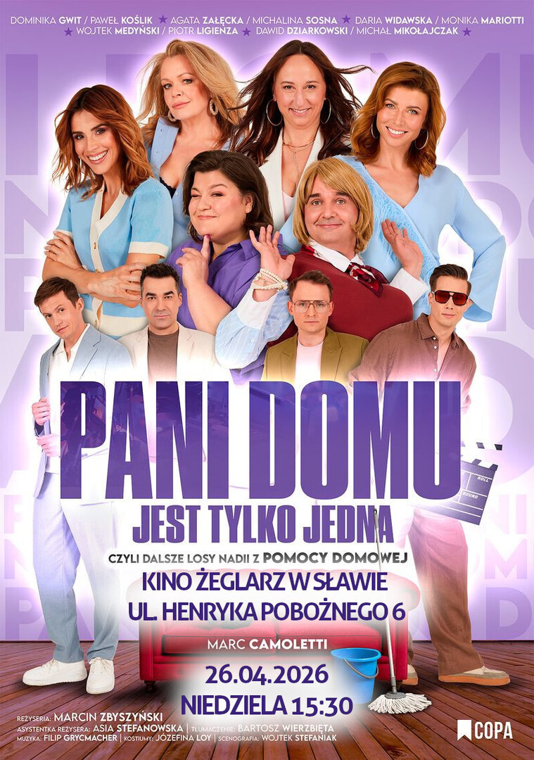 W niedzielę 26 kwietnia o godz. 15:30 Kino Żeglarz w Sławie gości farsę „Pani domu jest tylko jedna" w reżyserii teamu Copa.pl. Na scenie pojawią się znani aktorzy.