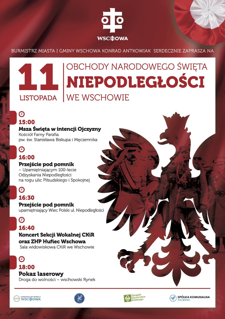 Organizatorami wschowskich obchodów 11 Listopada są Centrum Kultury i Rekreacji Wschowa, Związek Harcerstwa Polskiego Hufiec Wschowa oraz Spółka Komunalna Wschowa. Wspólne świętowanie ma charakter otwarty dla wszystkich mieszkańców Wschowy i powiatu wschowskiego. – Niech ten dzień będzie pełen biało-czerwonych barw, radości i wspólnego świętowania – zachęca burmistrz Antkowiak.