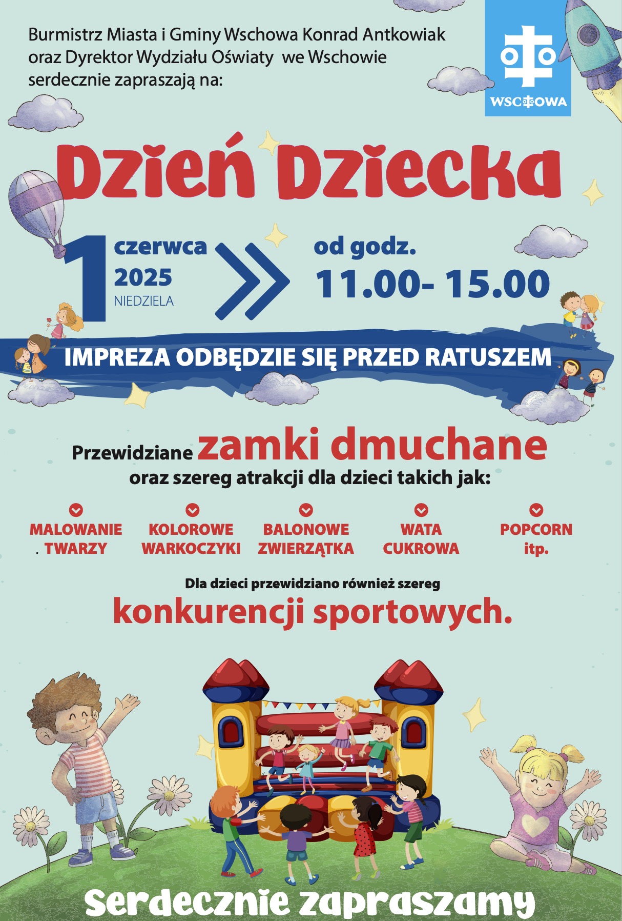 Burmistrz Konrad Antkowiak i Dyrektor Wydziału Oświaty Monika Bober zapraszają na Dzień Dziecka 1 czerwca we Wschowie. Impreza odbędzie się przed ratuszem w godzinach 11.00 - 15.00.
