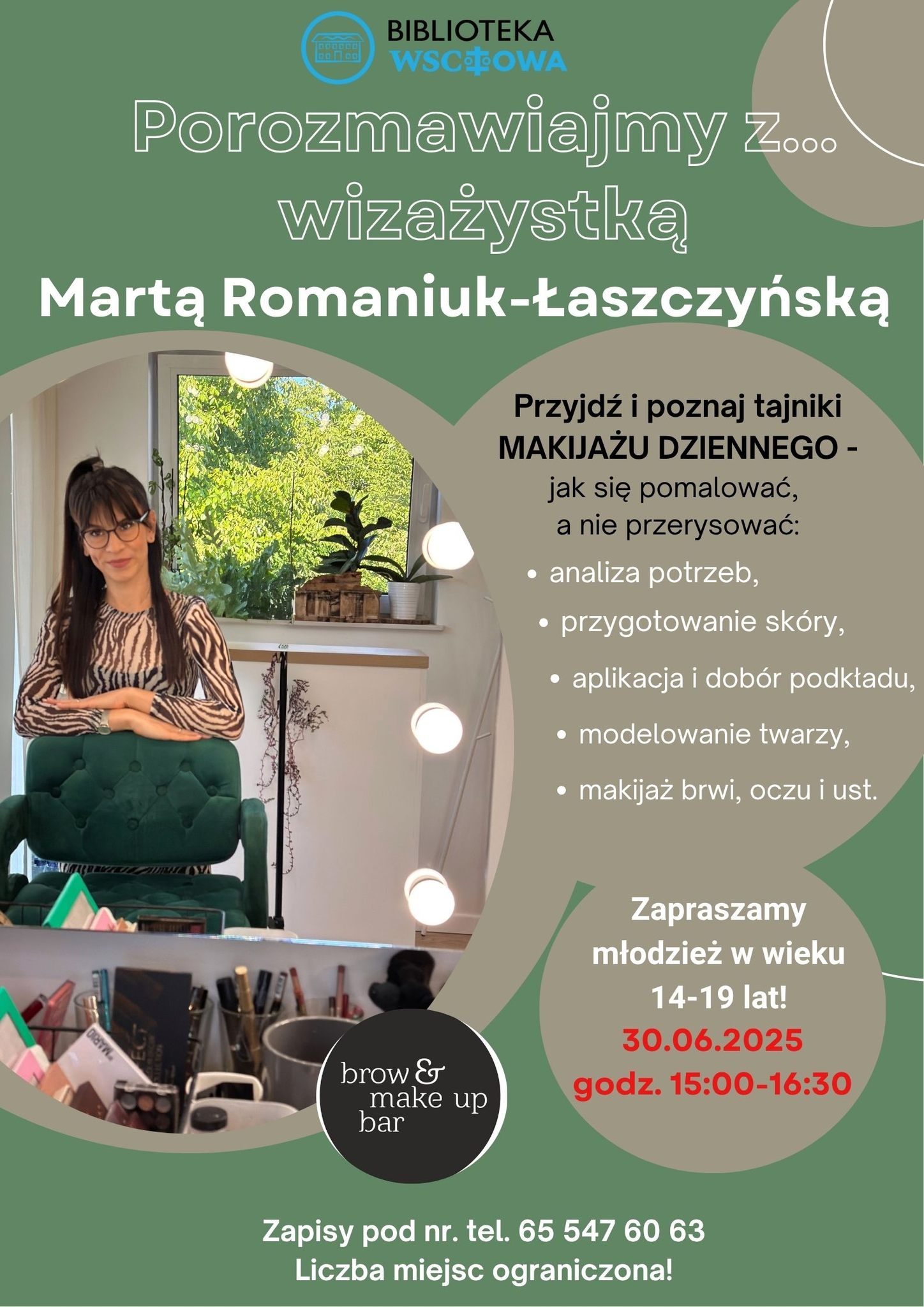 Biblioteka Publiczna Miasta i Gminy we Wschowie organizuje warsztaty makijażu dziennego dla młodzieży. Spotkanie z wizażystką Martą Romaniuk-Łaszczyńską z Brow & Make up Bar odbędzie się 30 czerwca o godzinie 15:00.