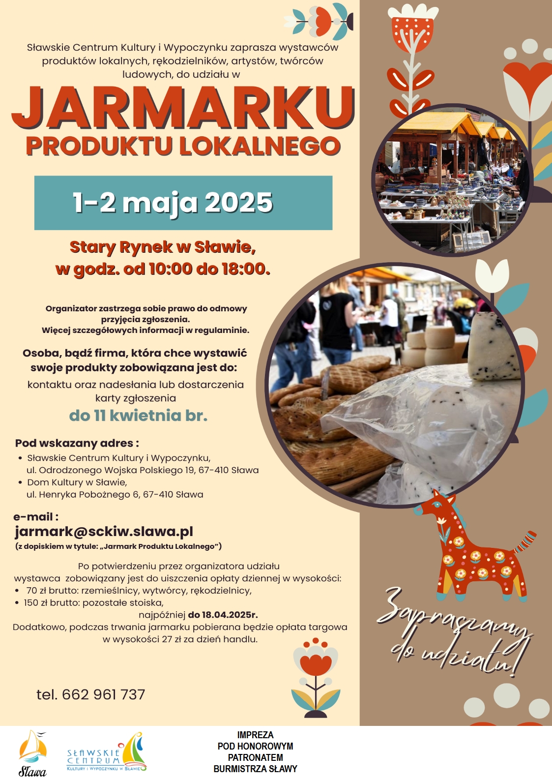 Lokalni rzemieślnicy, artyści i twórcy ponownie będą mieli okazję zaprezentować swoje wyroby w sercu Sławy. Sławskie Centrum Kultury i Wypoczynku ogłosiło nabór na Jarmark Produktu Lokalnego, który odbędzie się 1-2 maja 2025 roku na Starym Rynku. Wydarzenie odbędzie się pod honorowym patronatem Burmistrza Sławy.