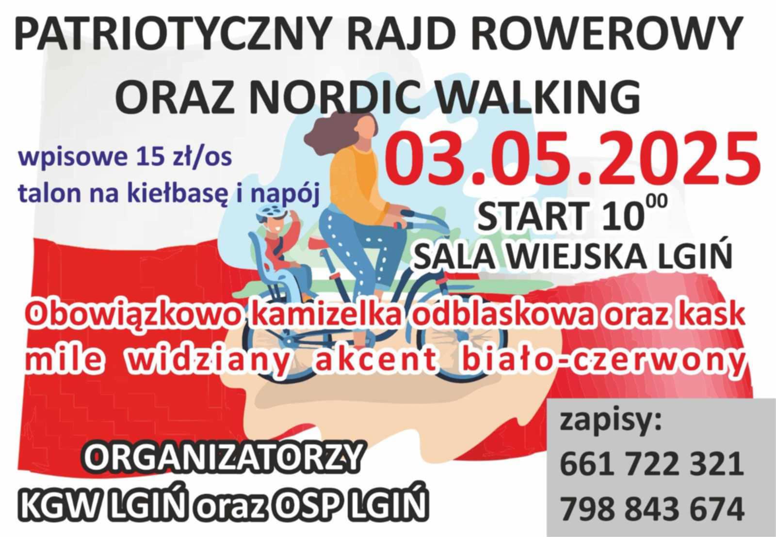 KGW i OSP Lgiń organizują rajd rowerowy i marsz nordic walking. Wydarzenie odbędzie się 3 maja. Start zaplanowano na godzinę 10:00 spod Sali Wiejskiej. Organizatorzy zapraszają wszystkich zainteresowanych.