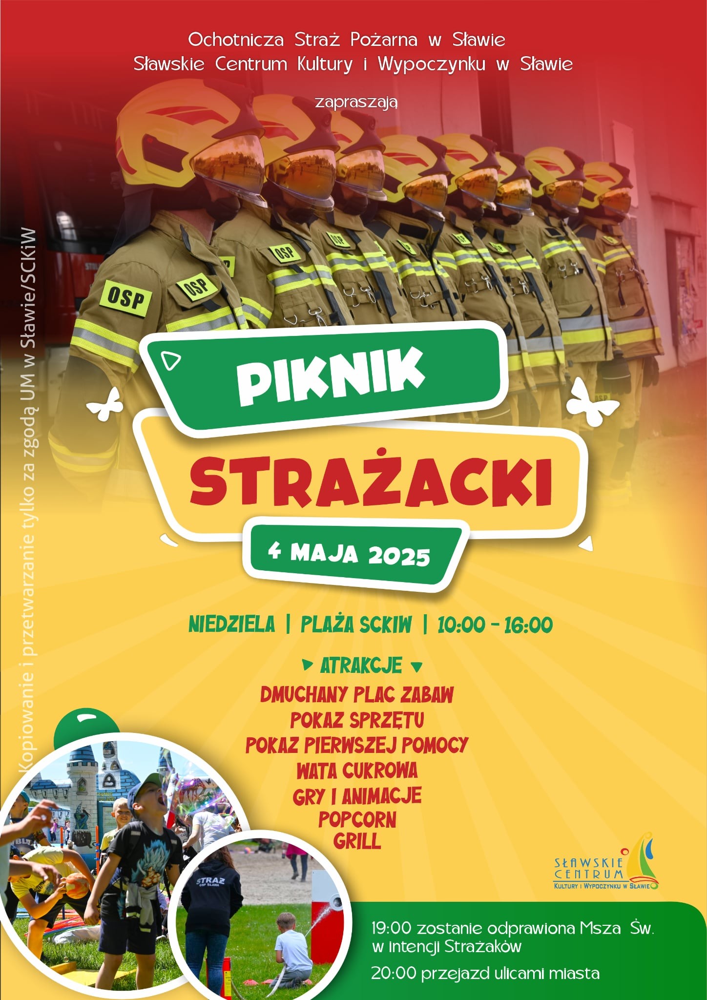Ochotnicza Straż Pożarna w Sławie i Sławskie Centrum Kultury i Wypoczynku organizują Piknik Strażacki z okazji Dnia Strażaka. Wydarzenie odbędzie się w niedzielę, 4 maja 2025 roku, na terenie przy tzw. Starej Plaży w Sławie. Program przewiduje rodzinne atrakcje od godziny 10:00 do 16:00, wieczorem zaplanowano mszę świętą i uroczysty przejazd pojazdów bojowych ulicami miasta.