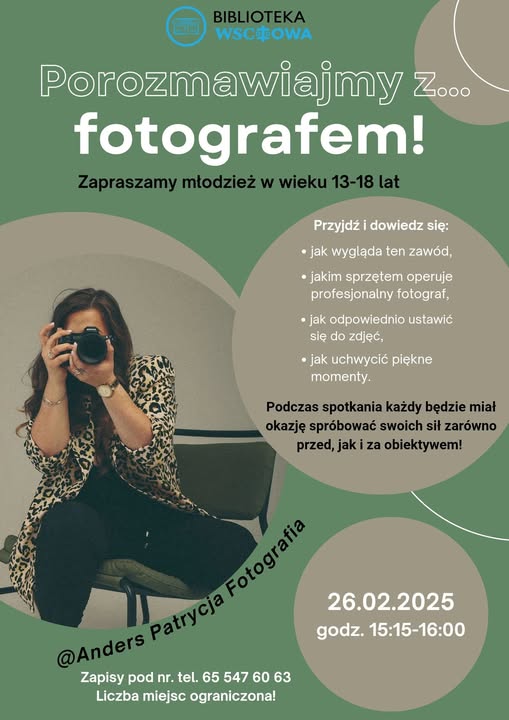 Warsztaty poprowadzi Patrycja Anders, która nie tylko opowie o kulisach pracy fotografa, ale także pokaże, jak operować światłem, dobierać kadry i wydobywać emocje na zdjęciach. Młodzież będzie miała okazję wcielić się zarówno w rolę fotografa, jak i modela.