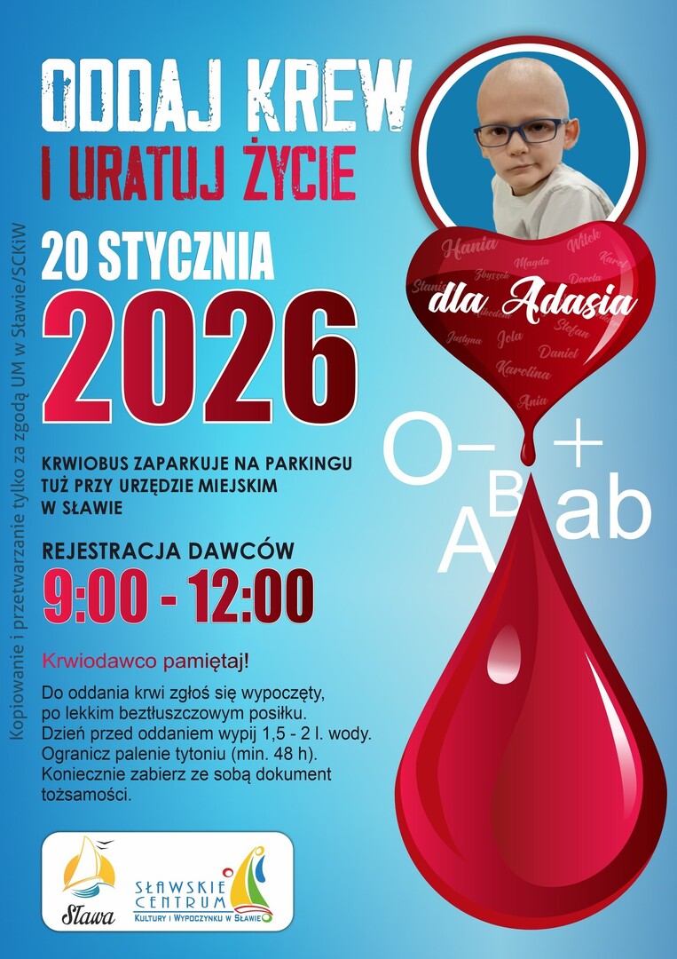 Przy Urzędzie Miejskim w Sławie zaparkuje mobilny punkt poboru krwi. Pierwsza tegoroczna akcja krwiodawstwa dedykowana jest Adasiowi Balińskiemu – młodemu mieszkańcowi gminy, który potrzebuje regularnych transfuzji.