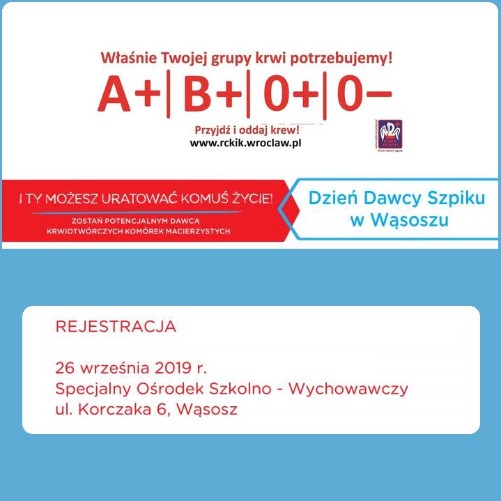 Ważna informacja dla krwiodawców lub tych, którzy chcą zacząć oddawać życiodajny płyn. 26 września odbędzie się akcja oddawania krwi w Specjalnym Ośrodku Szkolno-Wychowawczym w Wąsoszu. Wszystko we współpracy z RCKiK w Głogowie. Każdy ma szansę uratować komuś życie.