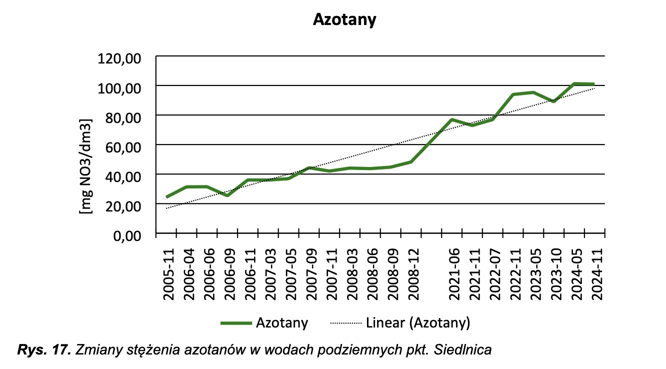 – Na przestrzeni lat systematycznie ulega zwiększeniu stężenie azotanów w wodach podziemnych. To już jest poziom, który wskazuje na klasę piątą – mówił Przemysław Susek o ujęciu wodociągowym w Siedlnicy. Stężenie azotanów wzrosło z 24,3 mg w 2005 roku do 101,5 mg NO3/dm³ w 2024 r.