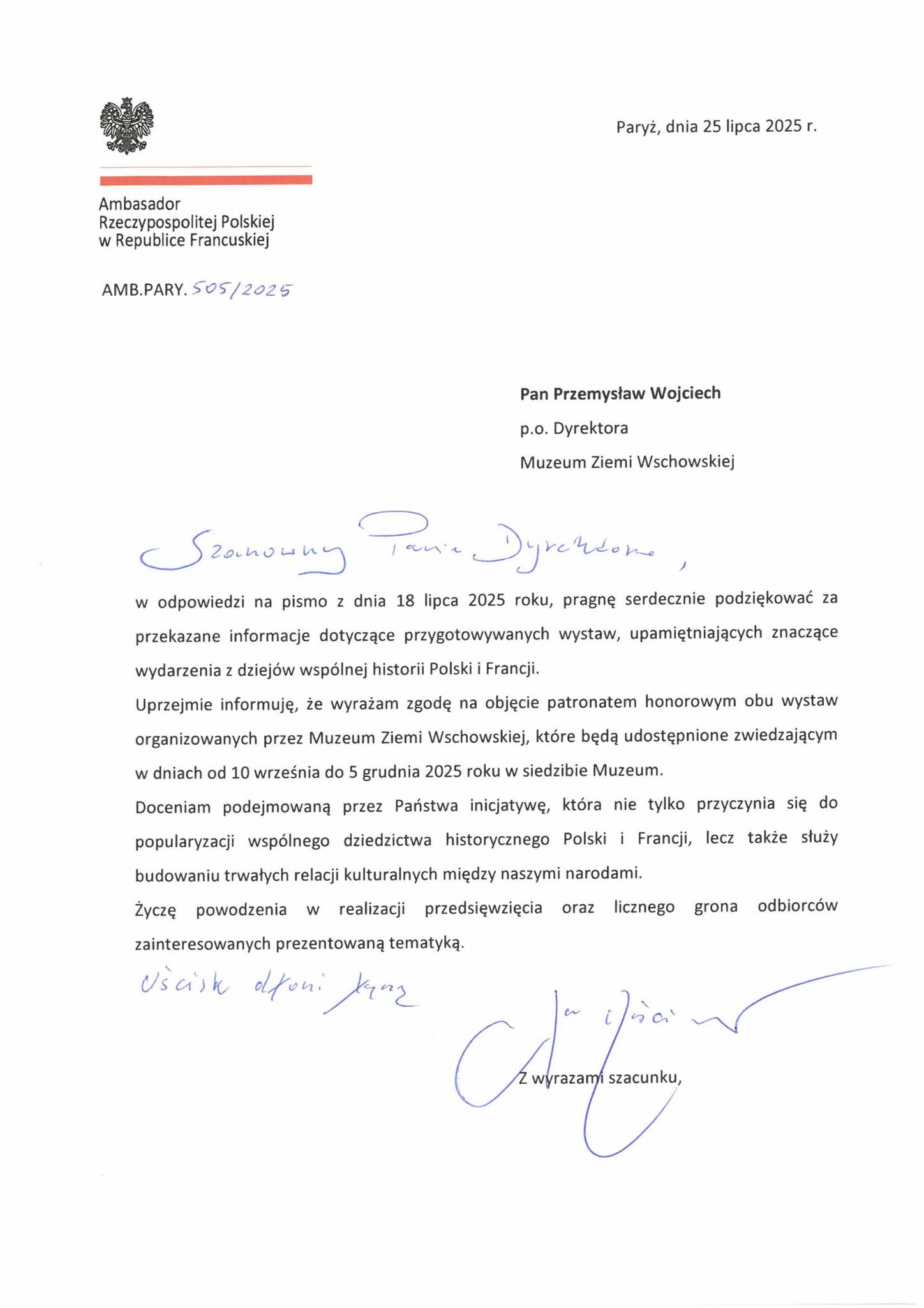 – Doceniam podejmowaną przez Państwa inicjatywę, która nie tylko przyczynia się do popularyzacji wspólnego dziedzictwa historycznego Polski i Francji, lecz także służy budowaniu trwałych relacji kulturalnych między naszymi narodami – napisał ambasador w odpowiedzi na pismo z 18 lipca. – Życzę powodzenia w realizacji przedsięwzięcia oraz licznego grona odbiorców zainteresowanych prezentowaną tematyką.
