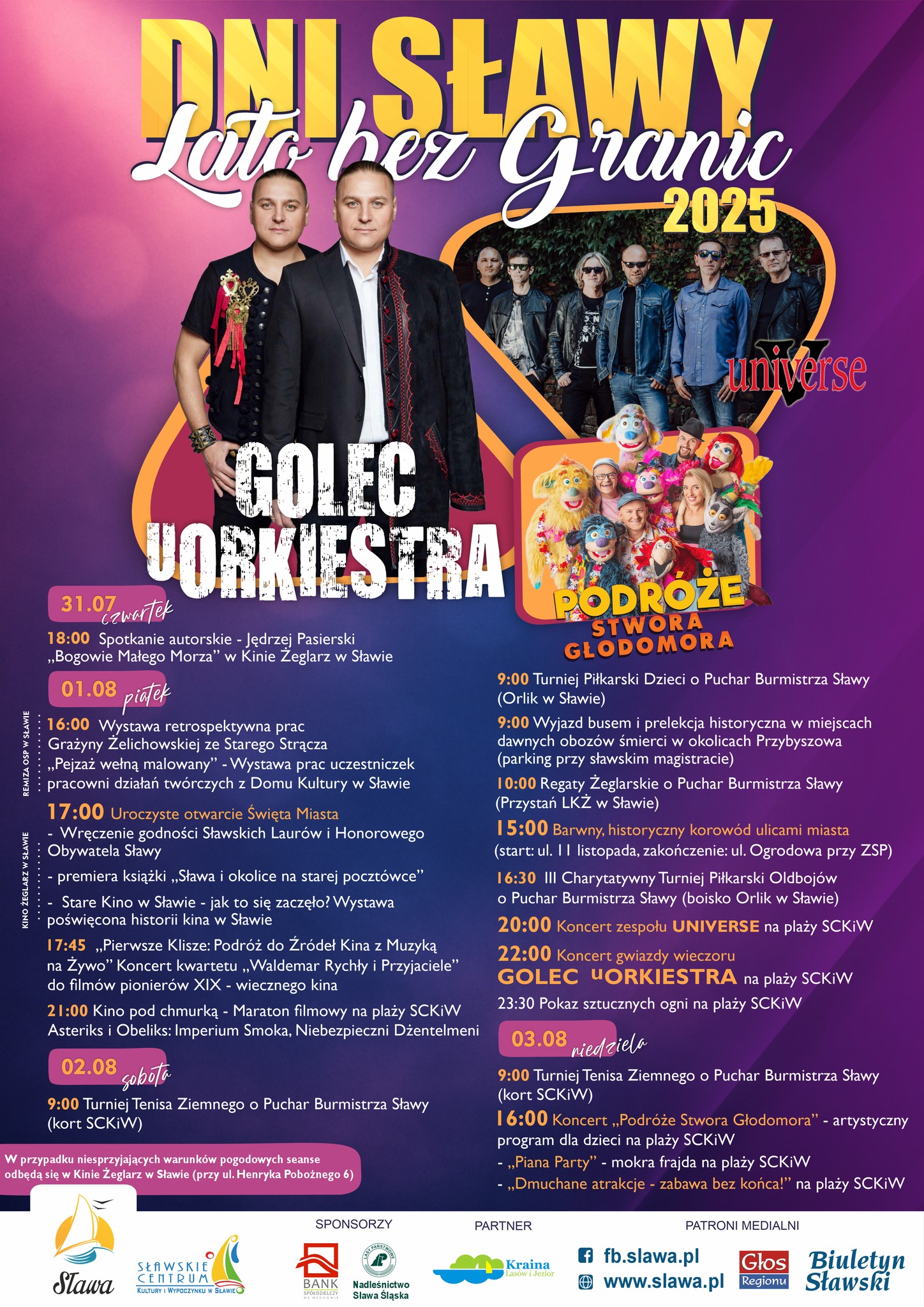 Urząd Miejski w Sławie wraz ze Sławskim Centrum Kultury i Wypoczynku zaprezentował szczegółowy harmonogram tegorocznego Lata bez Granic. Dni Sławy 2025 odbędą się w dniach 31 lipca - 3 sierpnia. Główną gwiazdą wieczoru będzie zespół Golec uOrkiestra, wybrany przez mieszkańców w internetowym plebiscycie.