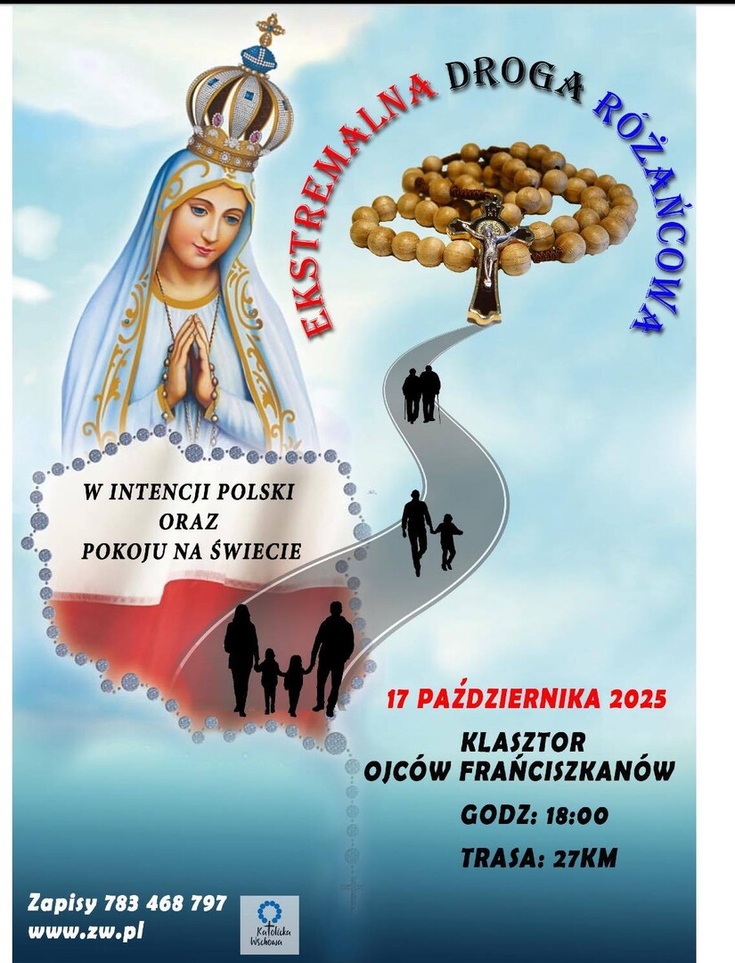 17 października Stowarzyszenie Katolicka Wschowa organizuje Ekstremalną Drogę Różańcową. Uczestnicy przejdą 25 kilometrów, modląc się za Polskę i pokój na świecie. Start o godz. 18:00 w kościele Ojców Franciszkanów.