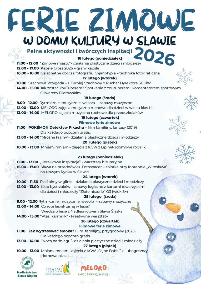 W sławskim Domu Kultury program rusza już pierwszego dnia ferii. 16 lutego od godz. 11.00 dzieci wezmą udział w zajęciach plastycznych pod hasłem "Zimowe miasto". Tego samego dnia od 12.00 rozstawione zostaną plansze do gry Kapsle Cross 2026. Wieczorem, od 16.00 do 18.00 – warsztaty cyjanotypii, czyli zapomnianej techniki fotograficznej.