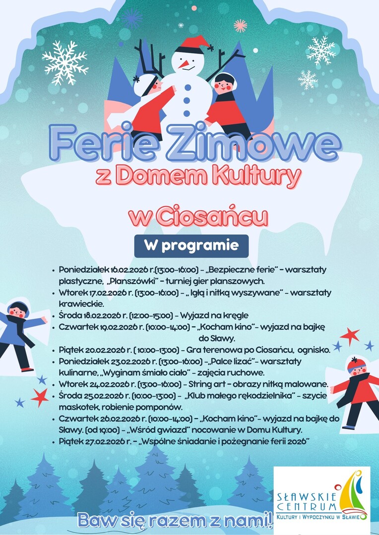 Dom Kultury w Ciosańcu przygotował program od 16 do 27 lutego. Pierwszy dzień to warsztaty plastyczne "Bezpieczne ferie" i turniej gier planszowych. We wtorek 17 lutego – warsztaty krawieckie "Igłą i nitką wyszywane". W środę 18 lutego zaplanowano wyjazd na kręgle.