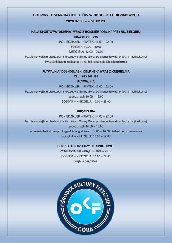 Ośrodek Kultury Fizycznej w Górze, opublikował informację z godzinami otwarcia obiektów sportowych. Warto zapoznać się, w jakich godzinach podczas ferii zimowych można udać się na halę sportową "Olimpia", pływalnię "Dolnośląski Delfinek", kręgielnie oraz boisko orlik.
