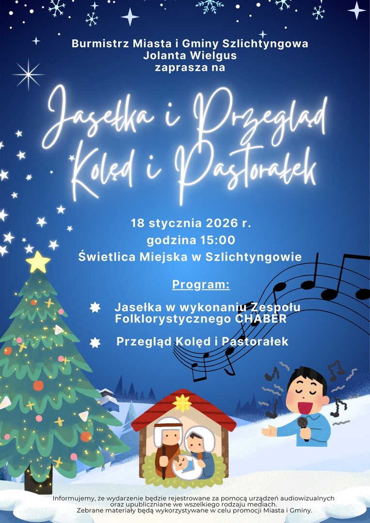 Burmistrz Jolanta Wielgus zaprasza mieszkańców gminy na Gminny Przegląd Kolęd i Pastorałek. Wydarzenie odbędzie się 18 stycznia 2026 roku o godzinie 15:00 w Świetlicy Miejskiej w Szlichtyngowie.