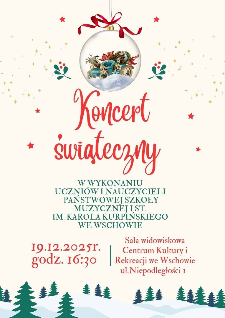 Państwowa Szkoła Muzyczna I stopnia im. Karola Kurpińskiego we Wschowie zaprasza na świąteczny koncert. Uczniowie i nauczyciele wystąpią w sali widowiskowej Centrum Kultury i Rekreacji.