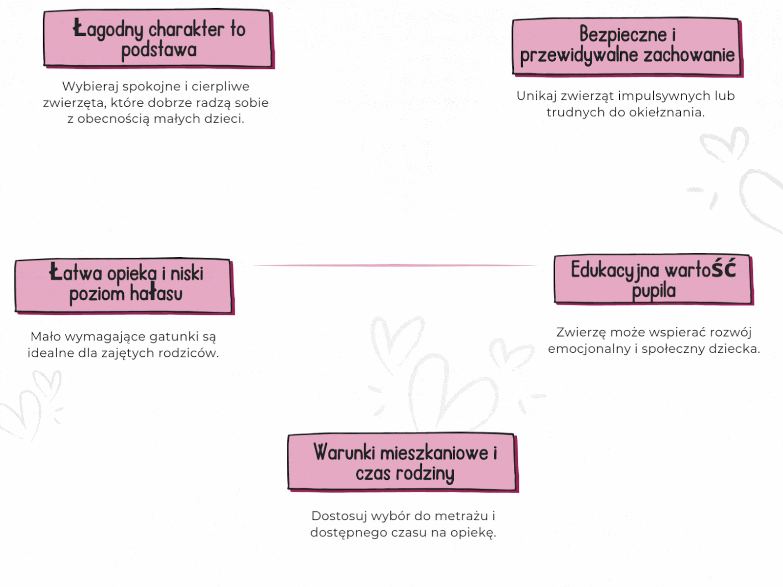 Dzieci w wieku przedszkolnym i niemowlęcym nie potrafią jeszcze w pełni kontrolować swoich emocji i zachowań. Dlatego zwierzę w takim domu musi być spokojne, przewidywalne i łagodne. Powinno tolerować hałas, niespodziewany dotyk oraz obecność innych osób. Zwierzę powinno też być łatwe w pielęgnacji, by nie stanowić dodatkowego obciążenia dla rodziców. Ważna jest też jego higiena i zdrowie – regularne wizyty u weterynarza to absolutna podstawa. Takie zwierzę będzie nie tylko przyjacielem, ale i cichym nauczycielem empatii i delikatności dla dziecka. Opiekunowie muszą pamiętać, że to oni odpowiadają za interakcje malucha z pupilem i za bezpieczeństwo obu stron.