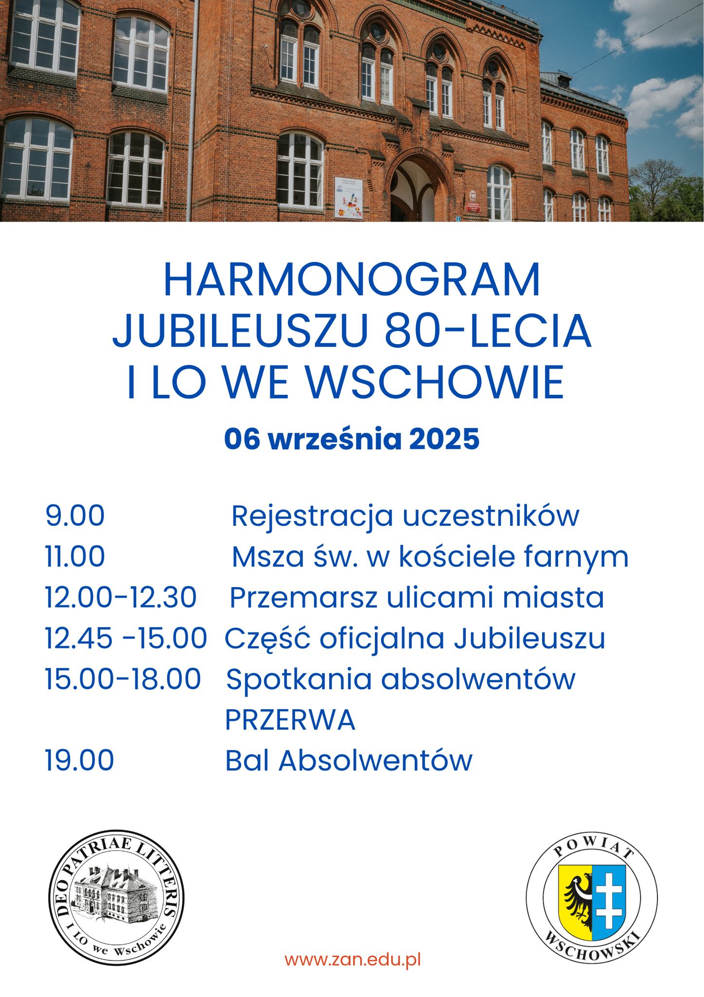 I Liceum Ogólnokształcące z Oddziałami Dwujęzycznymi im. Tomasza Zana we Wschowie opublikowało harmonogram jubileuszowych obchodów 80-lecia. Program na 6 września 2025 roku przewiduje uroczystości od rana do późnego wieczora.