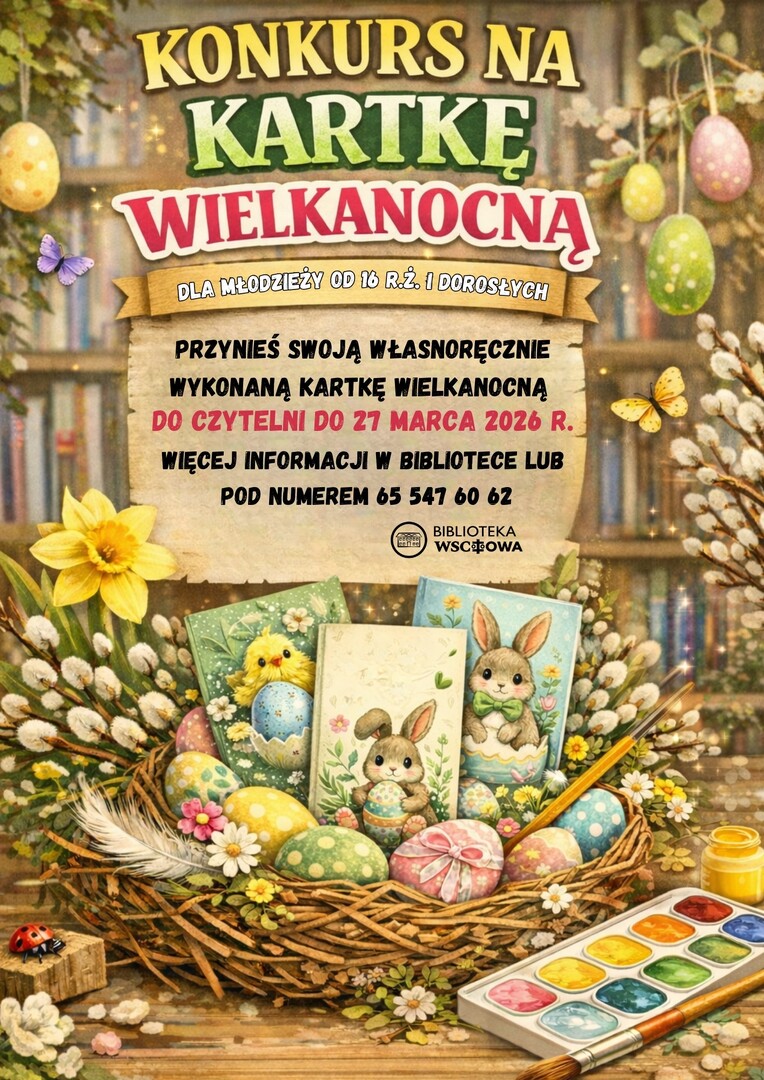 Biblioteka Publiczna Miasta i Gminy we Wschowie ogłosiła konkurs plastyczny „Kartka wielkanocna" skierowany do młodzieży od 16. roku życia i dorosłych. Prace można składać do 27 marca 2026 r. w siedzibie biblioteki przy Placu Farnym 3. Najlepsze kartki zostaną nagrodzone.