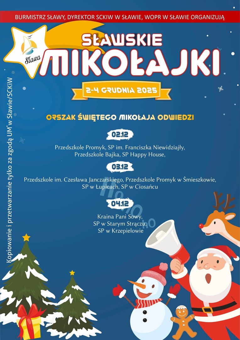 Mikołajkowy orszak to wspólna inicjatywa Burmistrza Sławy, Sławskiego Centrum Kultury i Wypoczynku oraz WOPR Sława. Podobna akcja odbyła się już w ubiegłym roku. Dyrektorzy wszystkich placówek otrzymali szczegółowe informacje o harmonogramie wizyt.