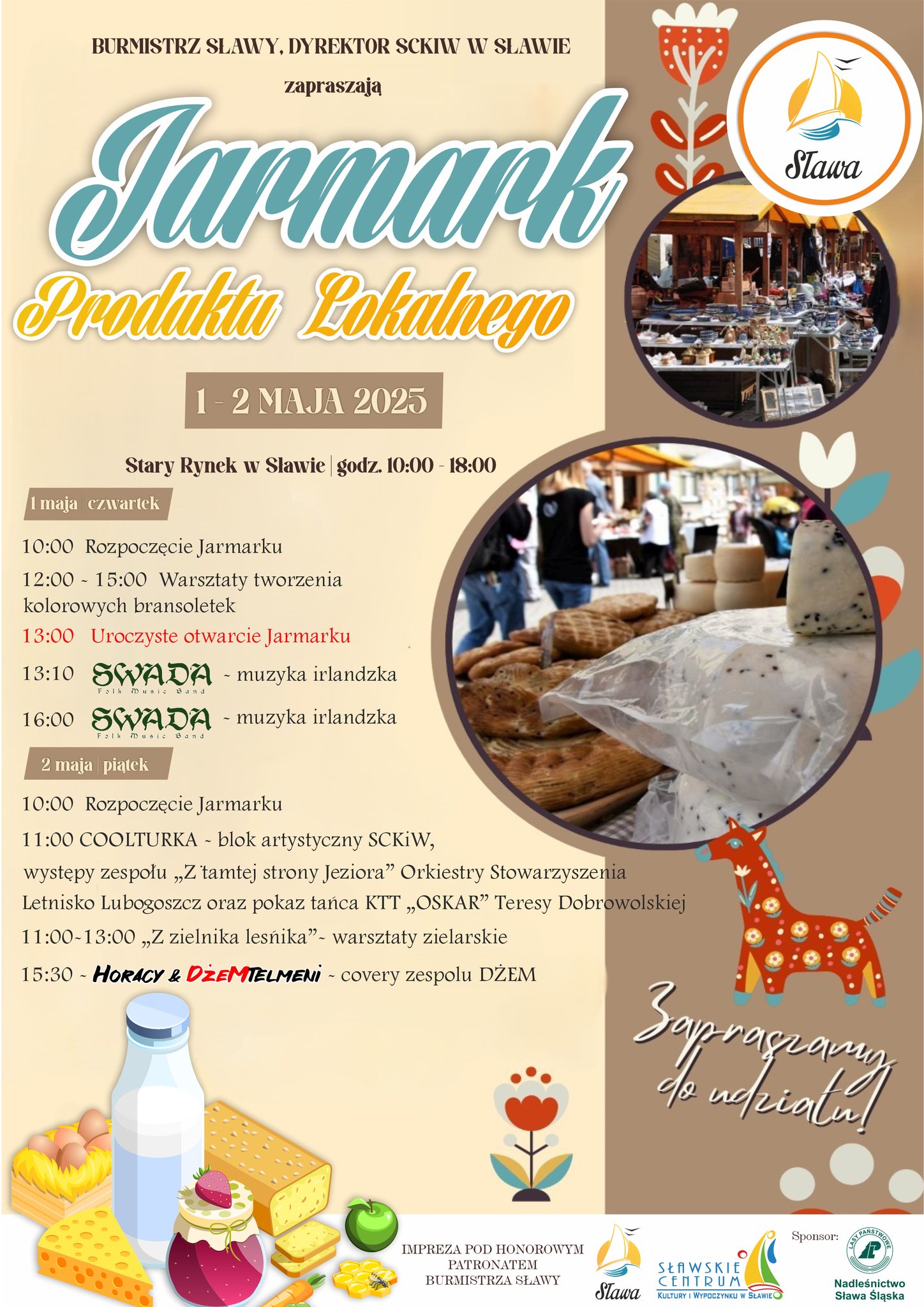 Dwudniowy Jarmark Produktu Lokalnego rusza 1 maja o godzinie 10:00. Organizatorzy zapowiadają nie tylko wystawców i rękodzielników, lecz także warsztaty, koncerty i występy artystyczne. Impreza odbywa się pod honorowym patronatem burmistrza Sławy.