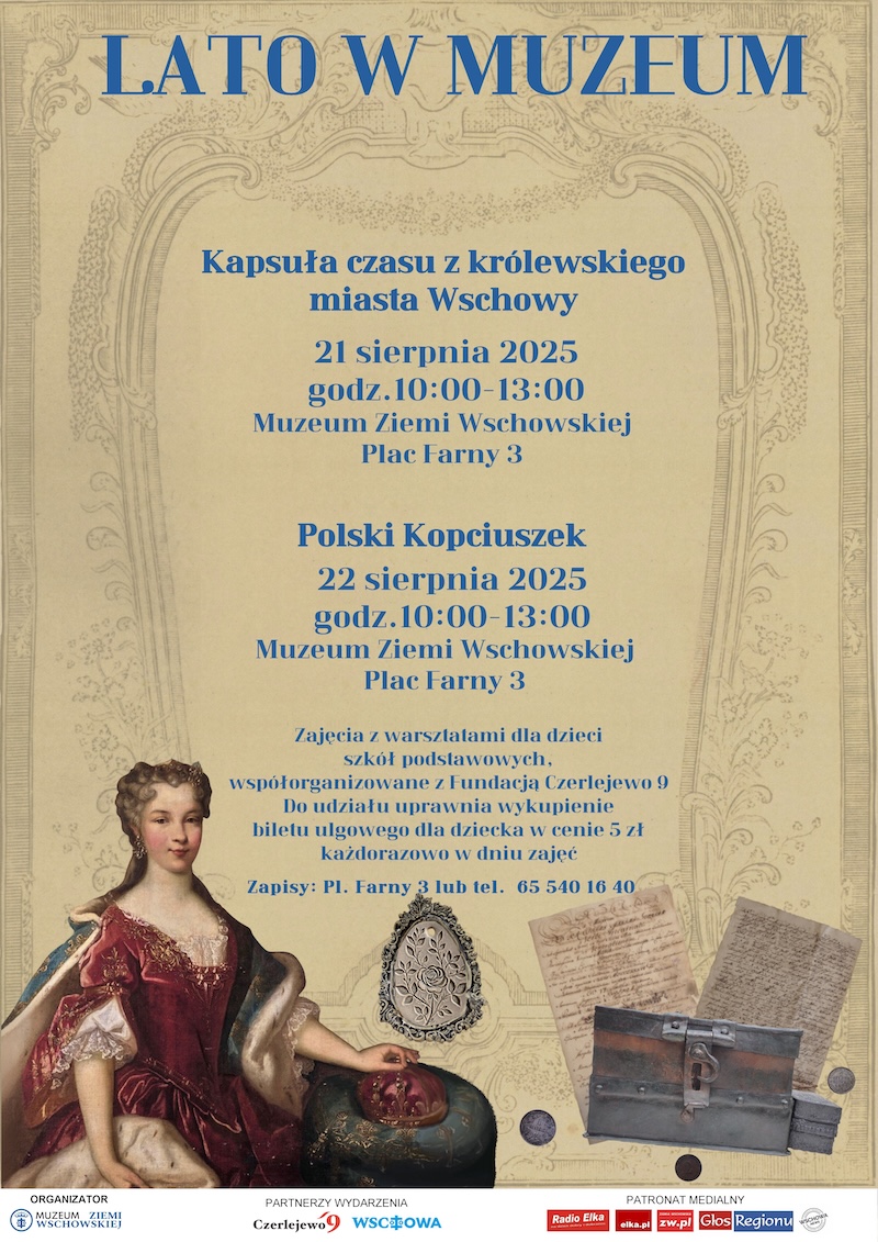 W czwartek i piątek (21-22 sierpnia) muzeum zaprasza dzieci i młodzież ze szkół podstawowych na warsztaty "Kapsuła czasu z królewskiego miasta Wschowy" i "Polski Kopciuszek". Zajęcia organizowane są wspólnie z fundacją Czerlejewo 9.