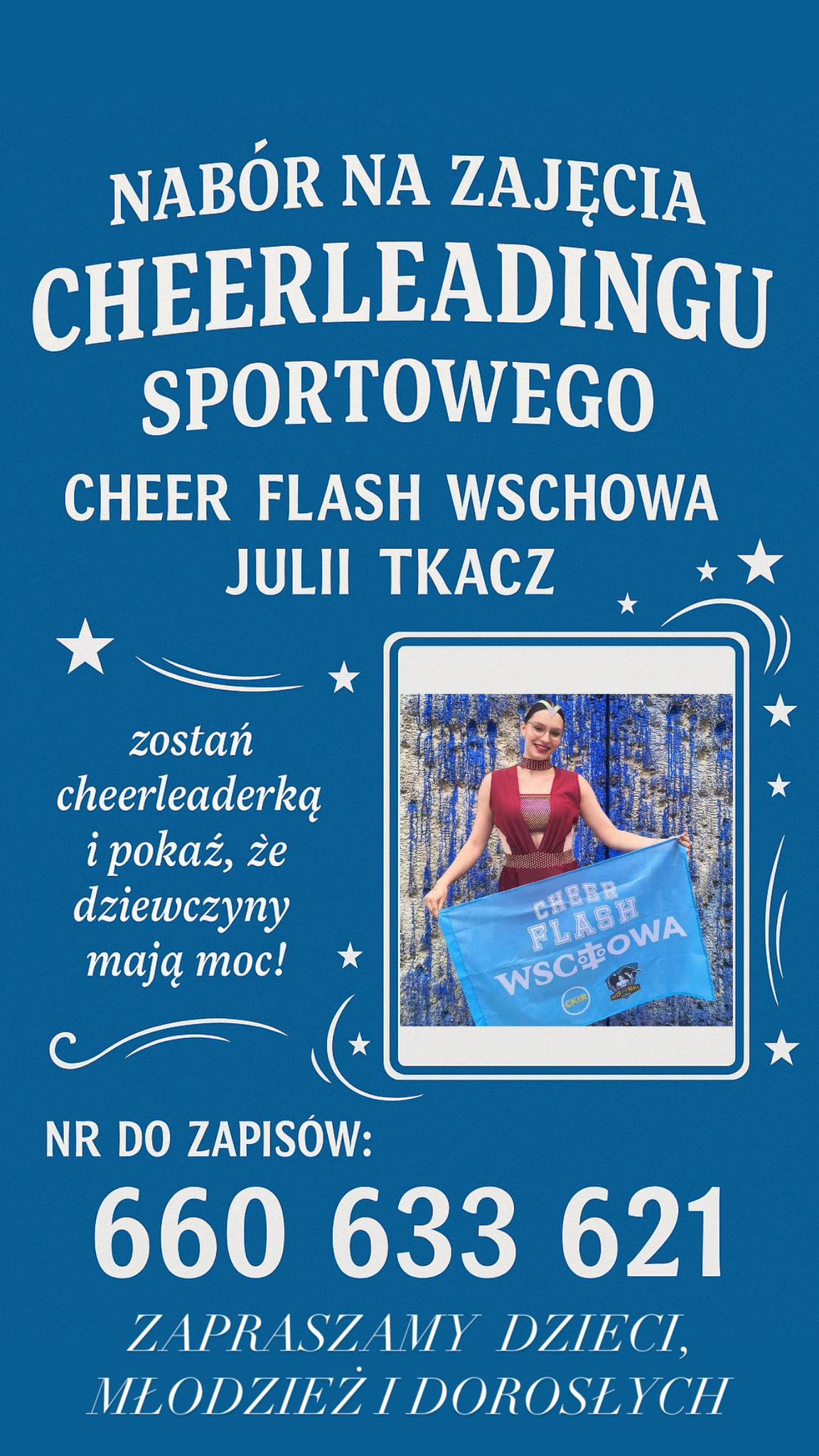 Klub Cheer Flash Wschowa Julii Tkacz ogłosił nabór na zajęcia cheerleadingu sportowego. Zajęcia odbywają się we Wschowie. Zapisy trwają pod numerem 660 633 621.