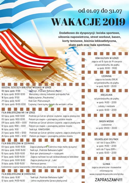 Bardzo ciekawie zapowiada się oferta zajęć wakacyjnych w gminie Góra. Wiele imprez odbędzie się w bibliotekach i filiach bibliotecznych. Również Dom Kutury w Górze oraz boiska spotowe, kręgielnia i baseny będą otwarte dla chętnych? Co, gdzie i kiedy?
