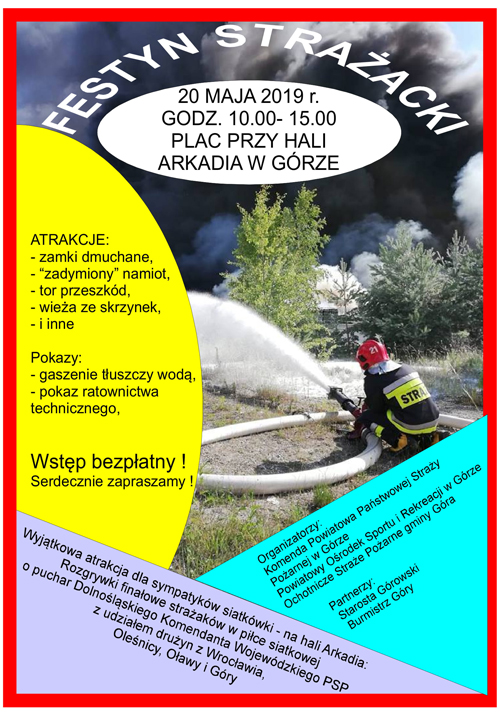 Komenda Powiatowa Państwowej Straży Pożarnej wraz z pozostałymi współorganizatorami zaprasza na festyn strażacki, który odbędzie sie 20 maja, w godzi. 10:00-15:00 na placy przy hali Arkadia w Górze.