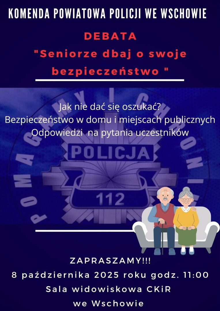Komenda Powiatowa Policji we Wschowie organizuje debatę o bezpieczeństwie skierowaną do seniorów. Funkcjonariusze odpowiedzą na pytania dotyczące ochrony przed oszustwami oraz bezpiecznego funkcjonowania w codziennym życiu.