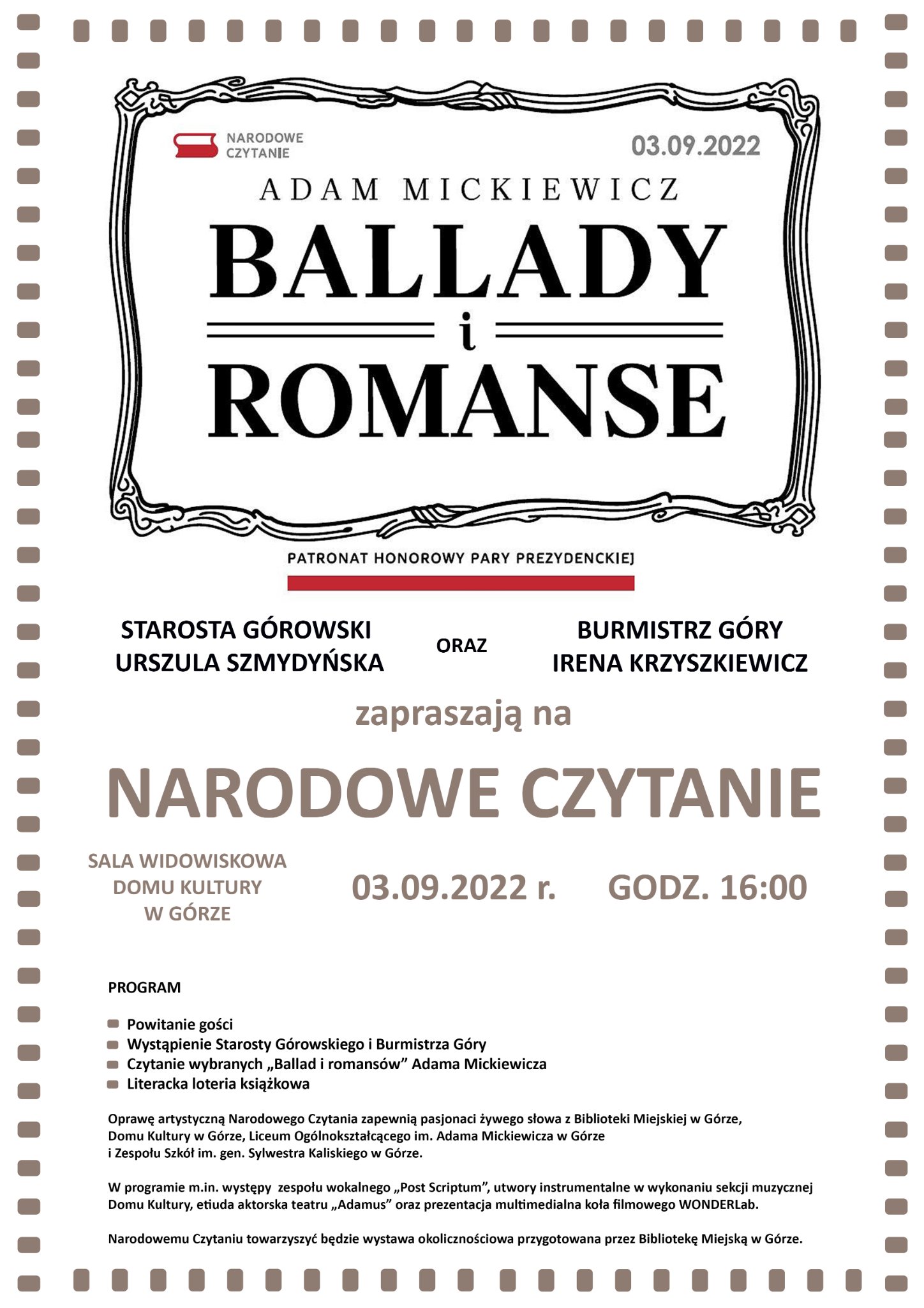 Starosta Górowski Urszula Szmydyńska oraz Burmistrz Góry Irena Krzyszkiewicz zapraszają na Narodowe Czytanie, które odbędzie się w sobotę (3 września) o godz. 16:00 w sali widowiskowej Domu Kultury w Górze.