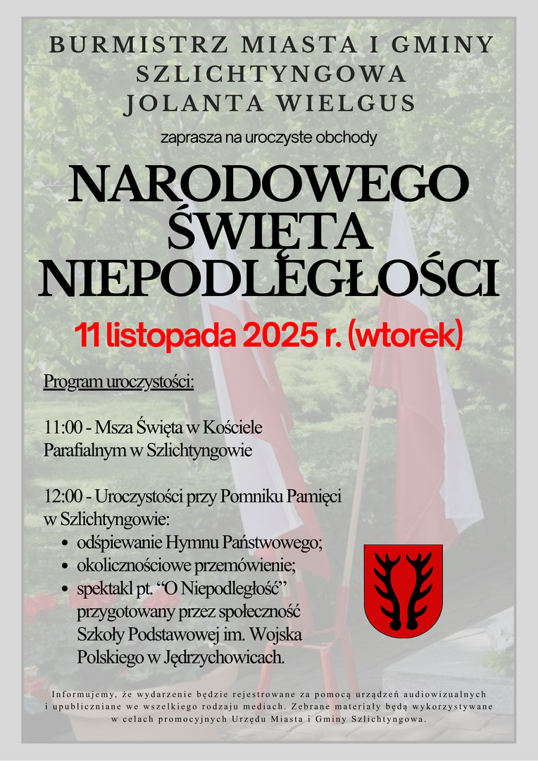 Burmistrz Jolanta Wielgus zaprasza mieszkańców Szlichtyngowej na gminne obchody Narodowego Święta Niepodległości. Uroczystości odbędą się we wtorek, 11 listopada 2025 roku. Program przewiduje Mszę Świętą, ceremonie przy Pomniku Pamięci i spektakl uczniów ze Szkoły Podstawowej w Jędrzychowicach.