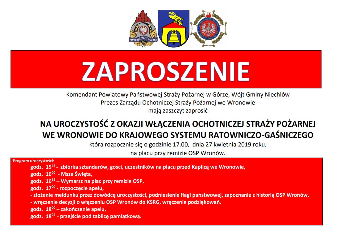 Na uroczystość z okazji włączenia OSP we Wronowie do krajowego systemu ratowniczo-gaśniczego zapraszają Komendant Powiatowy PSP w Górze, Wójt Gminy Niechlów oraz Prezes Zarządu OSP we Wronowie. Rozpoczęcie uroczystości nastąpi 27 kwietnia 2019 r. (sobota) o godz. 17:00 na placu przy remizie OSP Wronów.