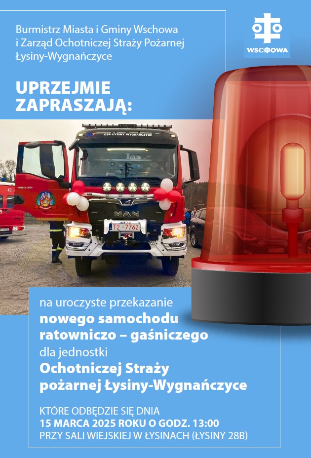 Na wydarzenie zapraszają burmistrz Miasta i Gminy Wschowa Konrad Antkowiak oraz zarząd OSP Łysiny-Wygnańczyce. W uroczystości wezmą udział przedstawiciele władz, strażacy oraz mieszkańcy.