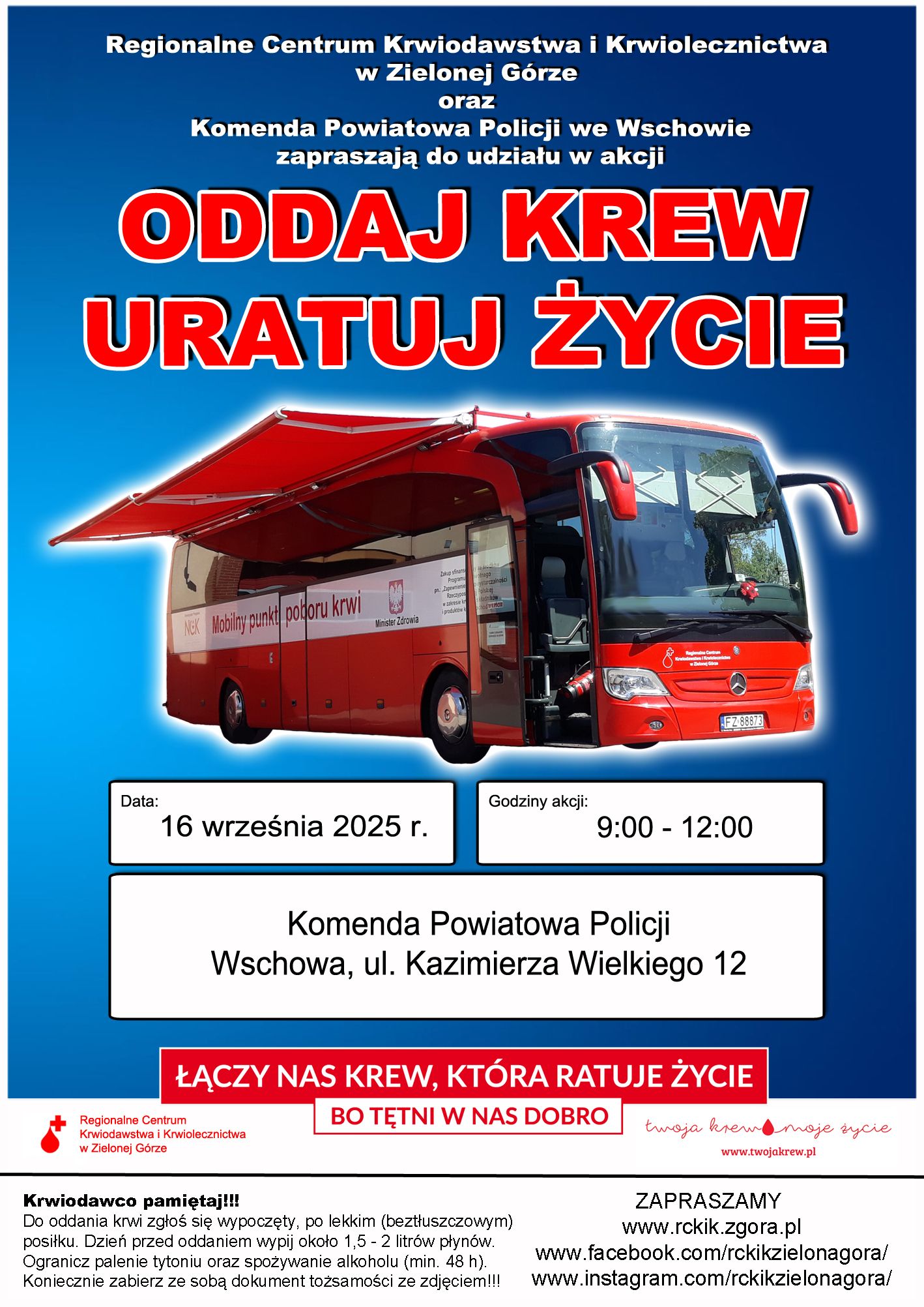 Akcja "Oddaj krew - uratuj życie" odbędzie się przy ulicy Kazimierza Wielkiego 12 we Wschowie. Organizatorami są Komendy Powiatowa Policji we Wschowie wspólnie z Regionalnym Centrum Krwiodawstwa i Krwiolecznictwa w Zielonej Górze.