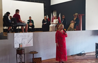 Na początku przedstawiono prezentację dotyczącą Gabrieli Zapolskiej, w ciekawy sposób przybliżającą postać autorki „Moralności Pani Dulskiej”. Potem młodzież czytała wybrane fragmenty utworu, umiejętnie i wiarygodnie wcielając się w rolę członków rodziny państwa Dulskich. Następnie uczniowie przedstawili tę samą scenę, ale w wersji… współczesnej. Udowodniło to wszystkim słuchaczom, że dzieło Gabrieli Zapolskiej jest ponadczasowe i wciąż aktualne w naszych czasach. Na zakończenie pierwszej części naszego spotkania uczniowie w szczery i mądry sposób odpowiadali na pytania dotyczące relacji rodzinnych, konfliktów międzypokoleniowych czy sposobów na szczęście w rodzinie.