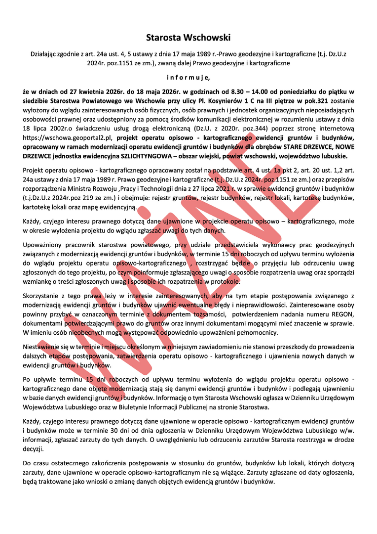 Starosta Wschowski poinformował o terminach wyłożenia projektu operatu opisowo-kartograficznego ewidencji gruntów i budynków. Dotyczy on dwóch obrębów w gminie Szlichtyngowa: Starych Drzewiec i Nowych Drzewiec.