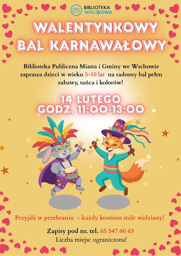 Biblioteka Publiczna Miasta i Gminy we Wschowie organizuje wyjątkowe wydarzenie dla najmłodszych. 14 lutego, w Walentynki, dzieci w wieku od 5 do 10 lat będą mogły wziąć udział w balu karnawałowym.