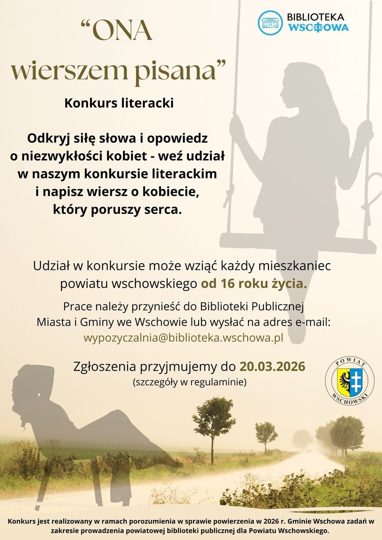 Biblioteka Publiczna Miasta i Gminy we Wschowie ogłosiła konkurs literacki „ONA wierszem pisana". Prace można zgłaszać do 20 marca. Udział jest bezpłatny, a wziąć udział może każdy mieszkaniec powiatu wschowskiego, który ukończył 16 lat.