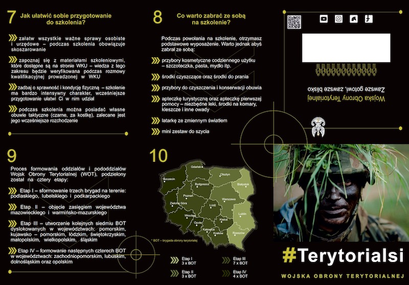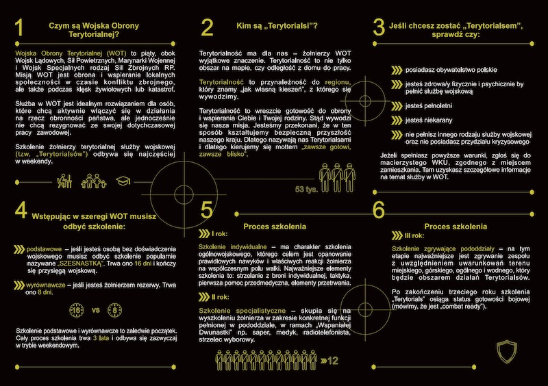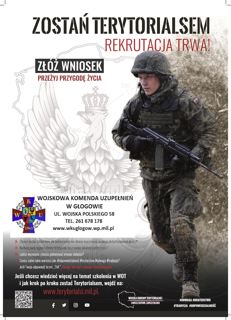Chcesz zostać żołnierzem TSW, ale jednocześnie nie chcesz rezygnować ze swojej dotychczasowej pracy? Kochasz swój region i chcesz działać na rzecz swojej lokalnej społeczności? Lubisz wyzwania i chcesz pokonywać własne słabości? Cenisz sobie takie wartości jak odpowiedzialność, braterstwo, odwaga, tradycja? Jeśli Twoja odpowiedź brzmi „TAK”, dołącz do Terytorialsów! - tak WKU w Głogowie zaprasza do naboru.
