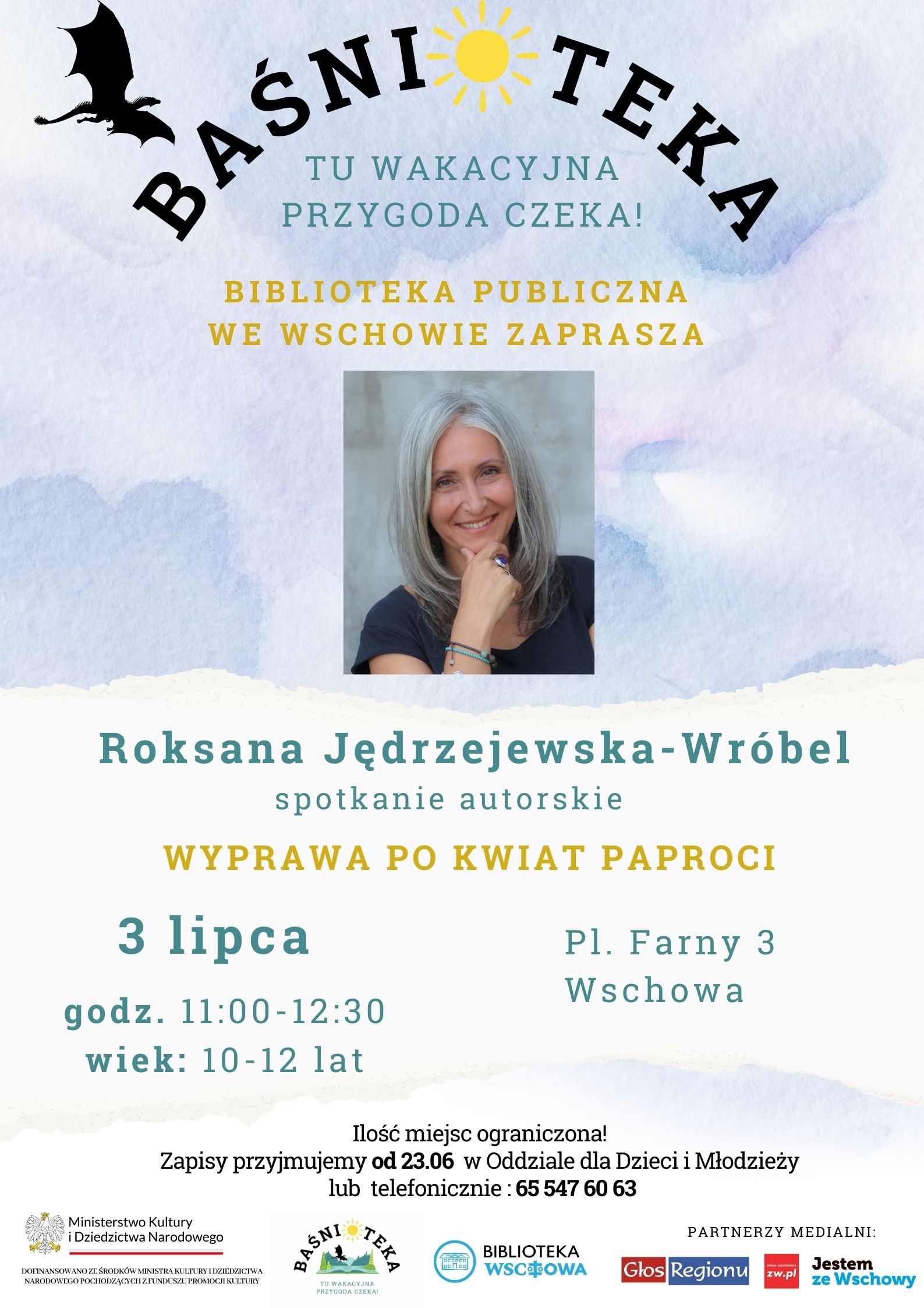 Roksana Jędrzejewska-Wróbel to doktor literaturoznawstwa, autorka kilkudziesięciu książek dla dzieci, powieści dla młodzieży oraz sztuk teatralnych. W swoim dorobku ma również słuchowiska, teksty do podręczników oraz bajki terapeutyczne. Spotkanie nosi tytuł "Wyprawa po kwiat paproci" i wpisuje się w realizowany przez bibliotekę projekt "Baśnioteka – tu wakacyjna przygoda czeka!".