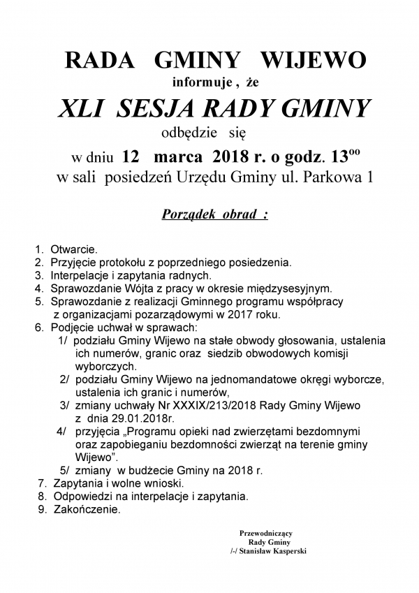 12 marca w sali posiedzeń Urzędu Gminy Wijewo odbędzie się XLI Sesja Rady Gminy Wijewo.
