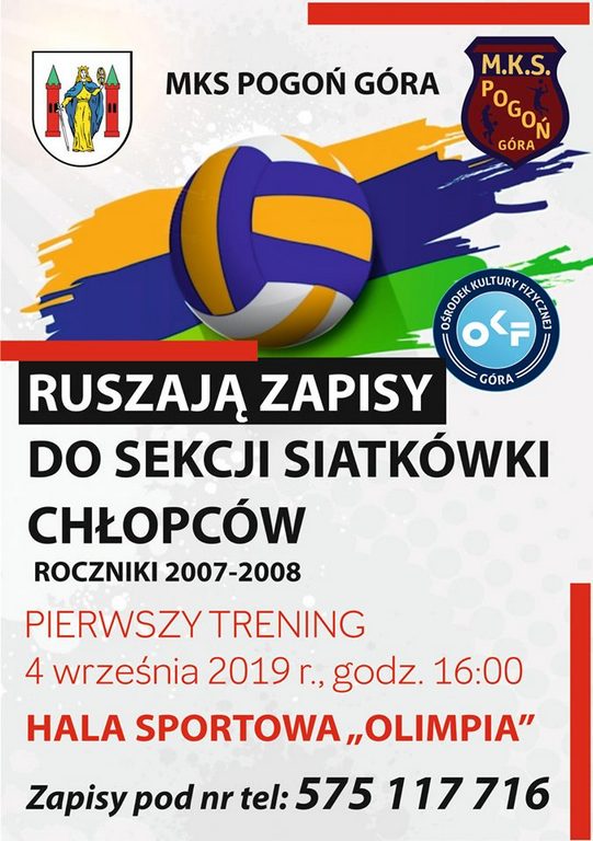 Czy twoje dziecko interesuje się siatkówką? Chce trenować? MKS Pogoń Góra prowadzi zapisy do sekcji siatkarskiej chłopców z roczników 2007-2008. Pierwszy trening już we wrześniu w hali sportowej "Olimpia".