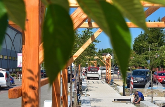 Parkingi, zjazdy, a także chodnik zostały ukończone. Na nowym trakcie spacerowym pojawiły się już niektóre z elementów małej architektury takie jak murki z betonu architektonicznego, drewniane pergole, dekoracyjne słupki oświetleniowe. W tym miejscu pojawią się jeszcze kosze, ławki, stojaki na rowery i stylizowane latarnie. W tym projekcie dużą uwagę poświęcono zieleni. Od jakiegoś już czasu, centrum miasta zdobią w sumie 62 młode drzewa odmiany Wiśnia Accolade. Ponadto w najbliższym czasie w okolicy przejść dla pieszych posadzone zostaną róże historyczne, a wzdłuż chodnika liczne trawy ozdobne, byliny a część terenu zdobić będzie trawnik. Drewniane pergole natomiast obrosną pnącą glicynią. Aktualnie trwają prace elektryczne, mające na celu montaż opraw dogruntowych, które finalnie doświetlać mają każde drzewo. Murki znajdujące się przy pasażu pokrywane są granitowymi płytami - na nich niebawem zamontowane zostaną także stylizowane słupki ze stalowymi taśmami.